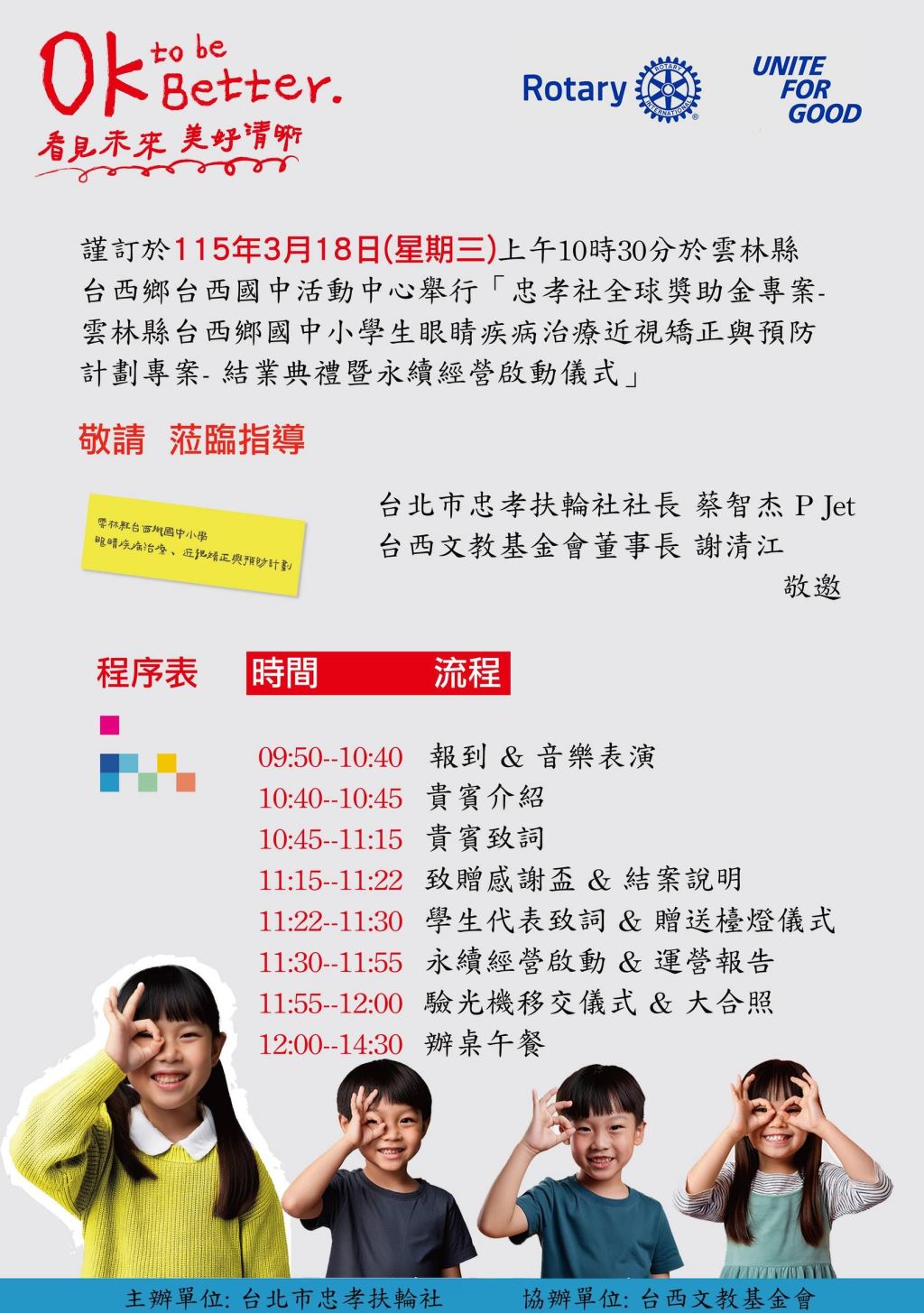 歷經三年(113-115年)的守護與堅持,由台北忠孝扶輪社發起、雲林縣政府指導的「看見未來 美好清晰」——雲林縣台西鄉偏鄉孩童視力保健計畫,即將圓滿告一段落。大會將於 115年3月18日(三) 假台西國中舉辦結業典禮及永續經營交接儀式,邀請各界共同見證這份愛心為偏鄉孩子帶來的顯著改變。